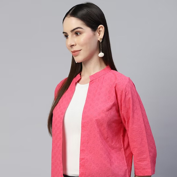 Pink self design open front regular shrug ,has three-quarter sleeves, straight hem